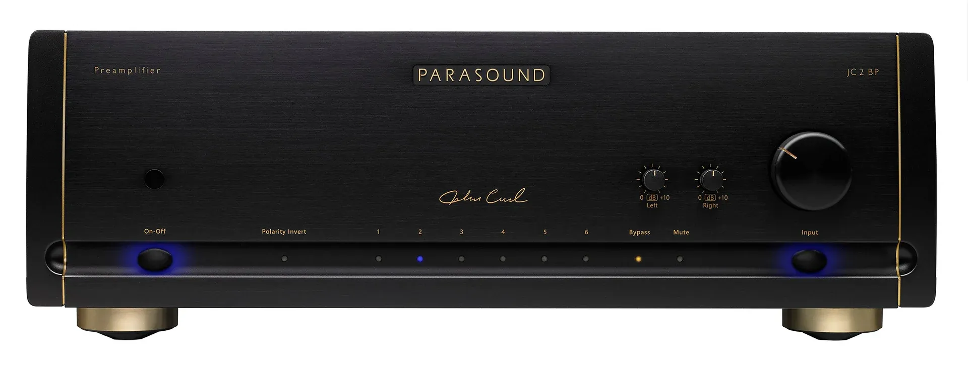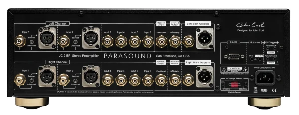 Home theater bypass enables seamless blending into a digital surround system Home theater bypass functions with both unbalanced & balanced inputs and outputs Home theater bypass function can be assigned to any input Bypass remains selected after unit has been turned off Improved remote control is included with the bypass assignment keys Specifications and sonic performance are 100% the same as the original JC 2 6 pairs unbalanced RCA line-level audio input jacks 2 input pairs can be switched to XLR balanced connectors Independent balanced/unbalanced select for the L & R channel Each channel's input is switched by its own gold-on-silver contact relay 4 output jack pairs with specialized functions: 1 Main output jack pair is balanced XLR, polarity is switched by remote 1 Main output jack pair is unbalanced RCA, polarity is switched by remote 1 output jack pair is unbalanced RCA, inverted polarity only 1 output pair is unbalanced RCA, normal polarity, fixed level for recorders Dual-mono left & right channel circuit boards minimize crosstalk Hand-matched complementary FETs Direct DC servo-coupled, no capacitors in the signal path Premium 4-gang motor-driven analog master volume control Separate TKD brand analog gain controls for L & R channel 3/8" thick aluminum shielding around audio boards Shielding prevents noise from power supplies & control circuits Separate output jacks for simultaneous normal & non-inverting polarity Aluminum chassis rear panel Remote control polarity switching uses gold-on-silver contact relays Vampire brand 24k gold-plated RCA jacks Neutrik brand premium XLR connectors Canare brand internal wiring High capacity R-core audio power transformer & inductor Hyper-fast soft recovery audio bridge rectifiers diodes Independent power supply for controller, relay coils, triggers, LEDs Remote control handset controls all functions Discrete IR codes for remote control Four 12v trigger output jacks for power amp auto turn-on: Two 12v trigger jacks are switched by the remote handset Two 12v trigger jacks are live when the JC 2 is turned on Two-way RS-232 serial port connection Line level inputs only; no inputs for phono Audio mute is switched by independent L & R relays Rear panel IR repeater input & loop out jacks Premium detachable heavy gauge IEC AC cord 2 6' (2m) trigger wires included Remote handset also controls Parasound Halo T 3 Tuner
